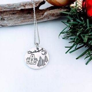 This handstamped Christmas necklace celebrates Santa's journey on Christmas Eve.